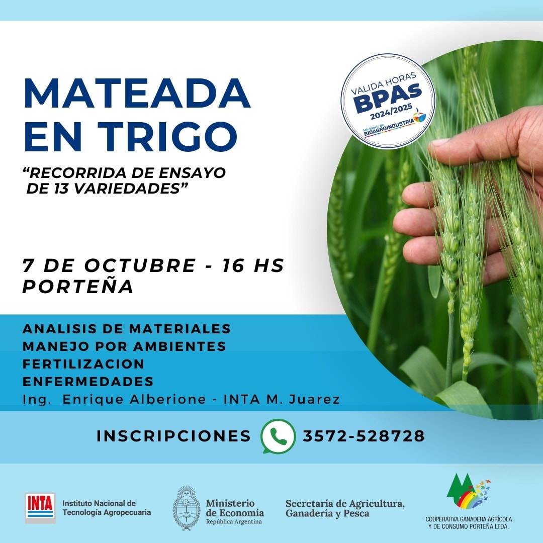 Dentro de las actividades propuestas desde la Agencia local del INTA Brinkmann, se convoca a todos los productores e interesados, a participar de la MATEADA EN TRIGO, a llevarse a cabo este martes 7 de octubre.