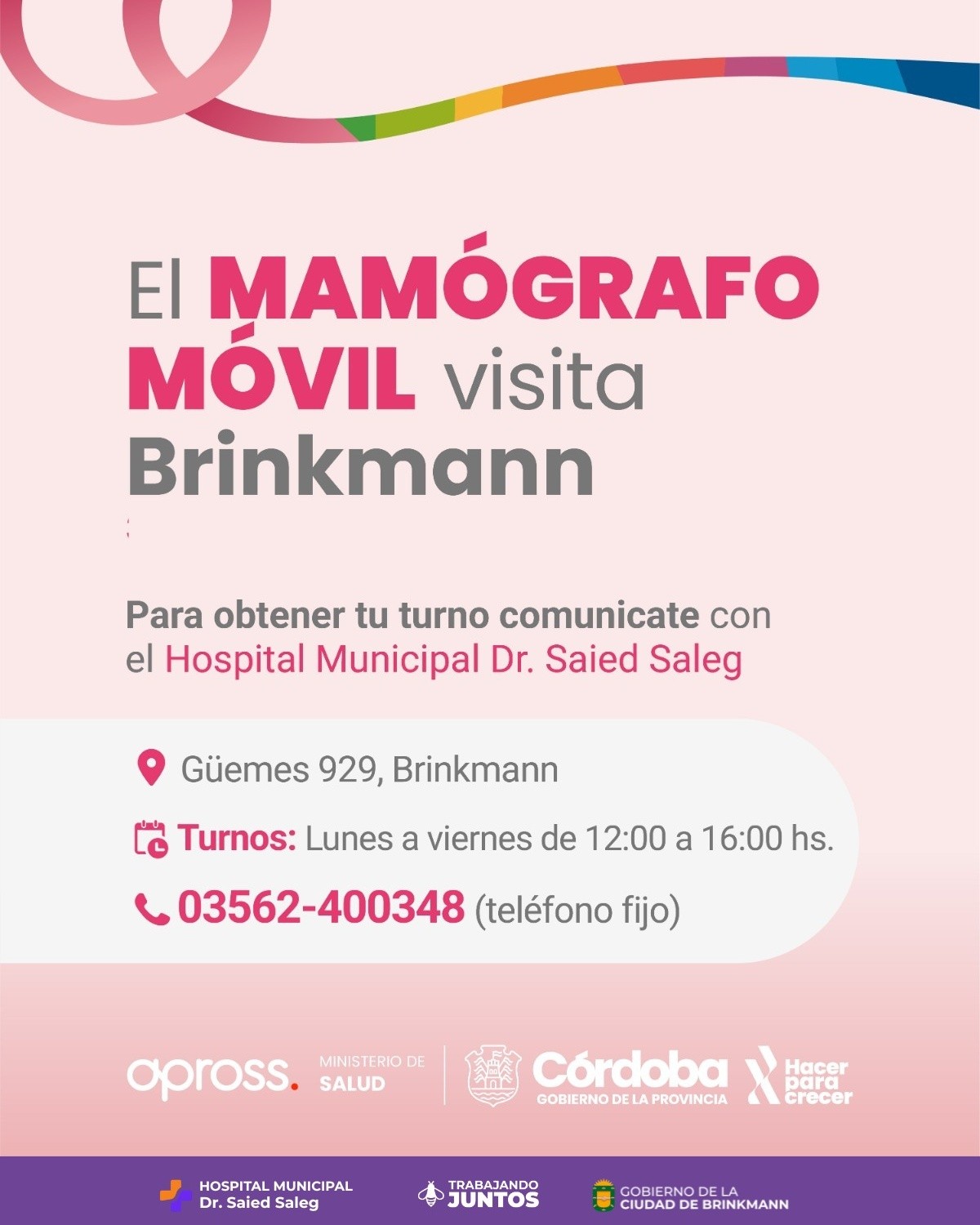 Comunicate con Hospital Municipal «Dr. Saied Saleg» o acercate de forma presencial para agendar tu turno y acceder a este servicio de detección temprana del cáncer de mama.