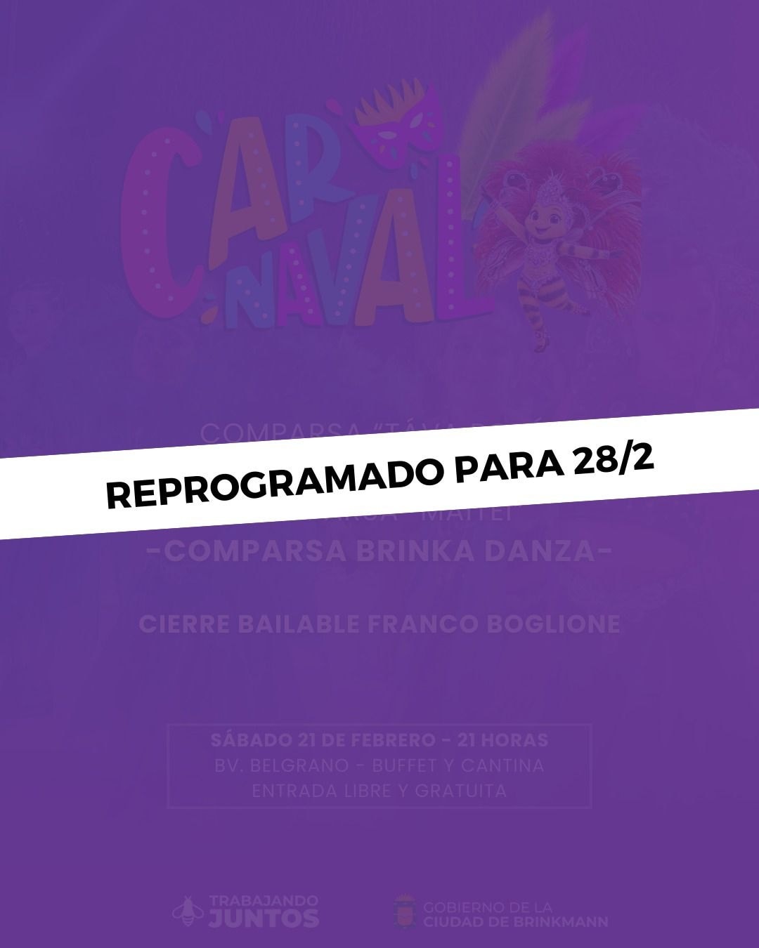 Debido a las condiciones climáticas adversas, la noche de carnaval en Brinkmann se reprograma para el sábado 28 de febrero.
