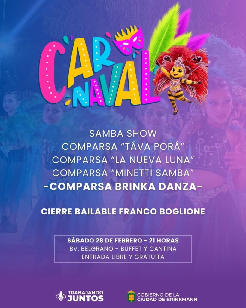 La Dirección de Cultura del Gobierno Municipal de Brinkmann, anuncia para este sábado la Noche Final de Carnavales 2026.
