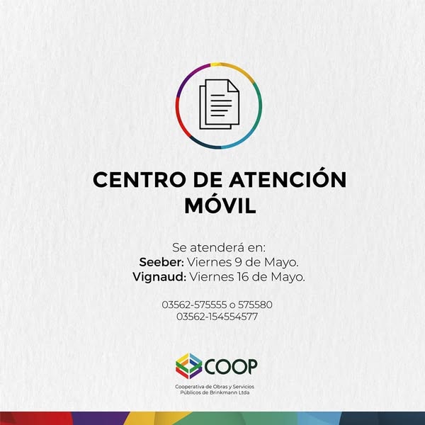 La Cooperativa de Obras y Servicios Públicos de Brinkmann implementa, nuevamente, el Centro de Atención móvil en las localidades de Seeber y Vignaud para atender consultas y tramites administrativos de nuestros asociados.