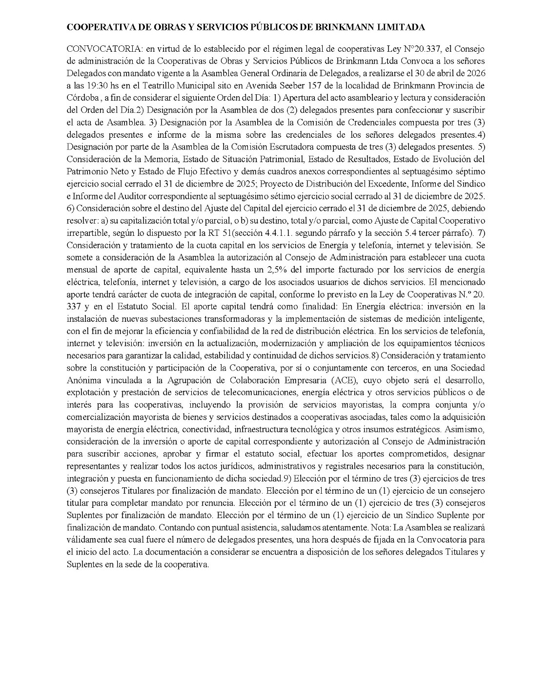 El jueves 30 de abril se realizará la Asamblea General Ordinaria de la Cooperativa de Obras y Servicios Públicos de Brinkmann Ltda., en virtud de lo establecido por el régimen legal de cooperativas ley n° 20337, donde se expondrá el balance general, estado de resultados y memoria del último ejercicio cerrado a fines del 2025.