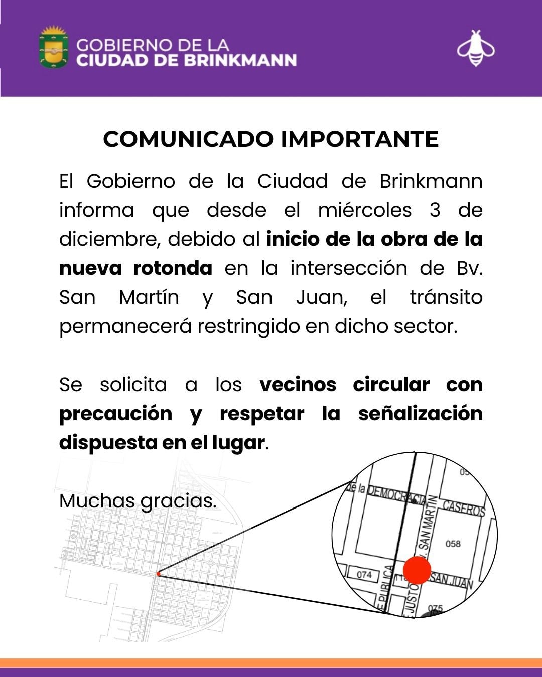 Por este motivo, se solicita a toda la comunidad circular con precaución por dicho lugar. Asimismo el paso de los colectivos sufrirá una modificación, hasta tanto concluya la obra.