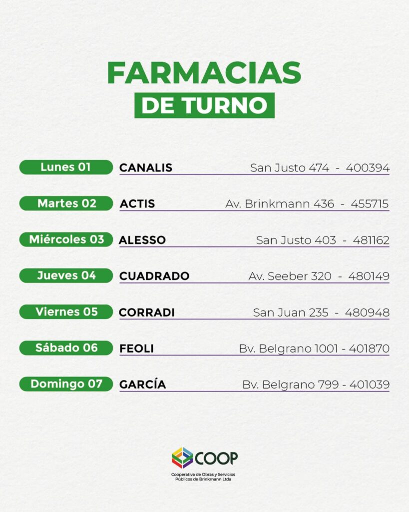 Compartimos farmacias de turno correspondiente a la primera semana del mes de diciembre de 2025.