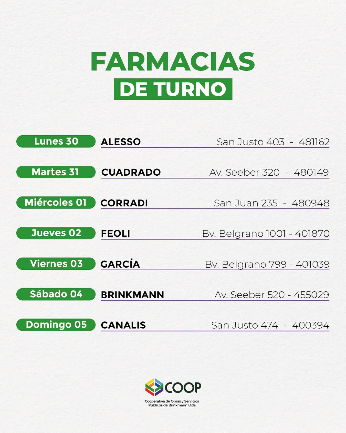 Compartimos Farmacias de Turno correspondientes a la corriente semana, con varios feriados.