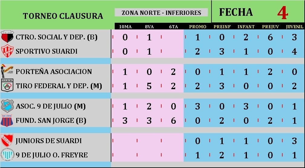 Se jugó la fecha 4 del Fútbol Infantil Zona Norte, y arriba sigue todo igual. Nueve de Morteros y San Jorge repartieron puntos. Centro Social recibió en todas las categorías a Sp. Suardi. Resultados y Posiciones Navegación de entradas Nueve de Morteros: Jugaron Especial de Bochas y aún no finalizó el torneo tradicionalClub San Jorge fue sede de Torneo de Padel APC en caballeros impares