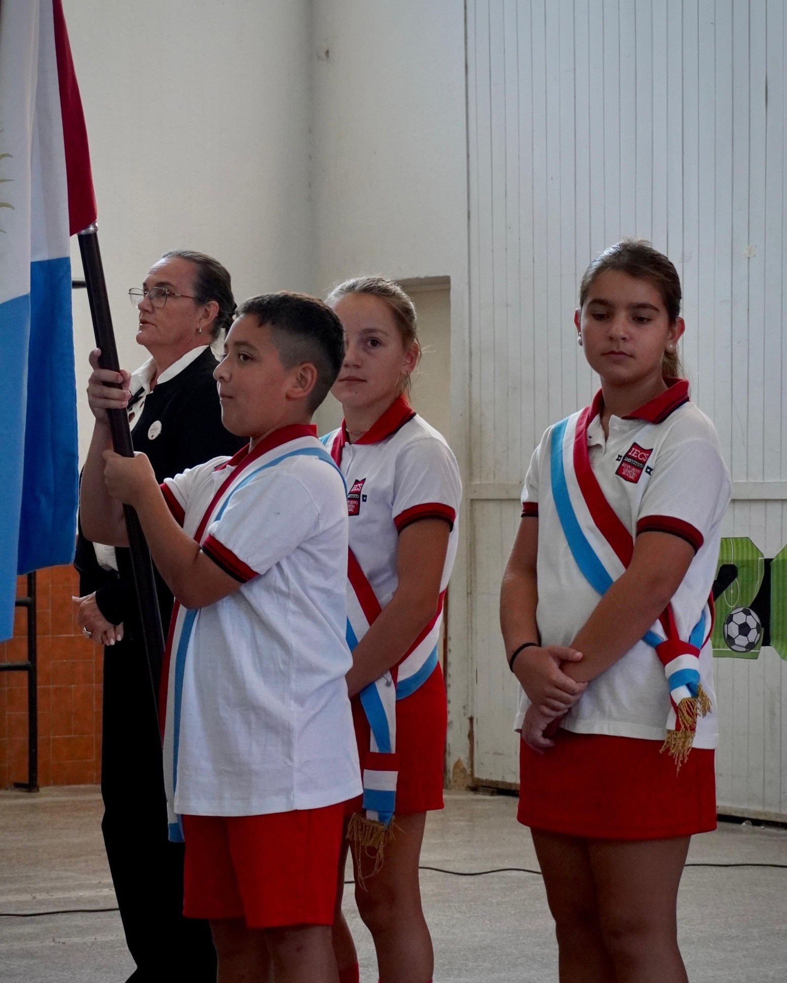 Por ende, al ritmo de una batucada inicial (a cargo de los alumnos de sexto grado), se produjo el ingreso de los alumnitos de la sala de 3 años (debutantes en nivel inicial) y los de primer grado (debutantes en el nivel primario). La escenografía que los esperaba, también estuvo acorde, con un arco de fútbol simbólico, que se adornó con globos con los colores nacionales y los rojinegros del club.