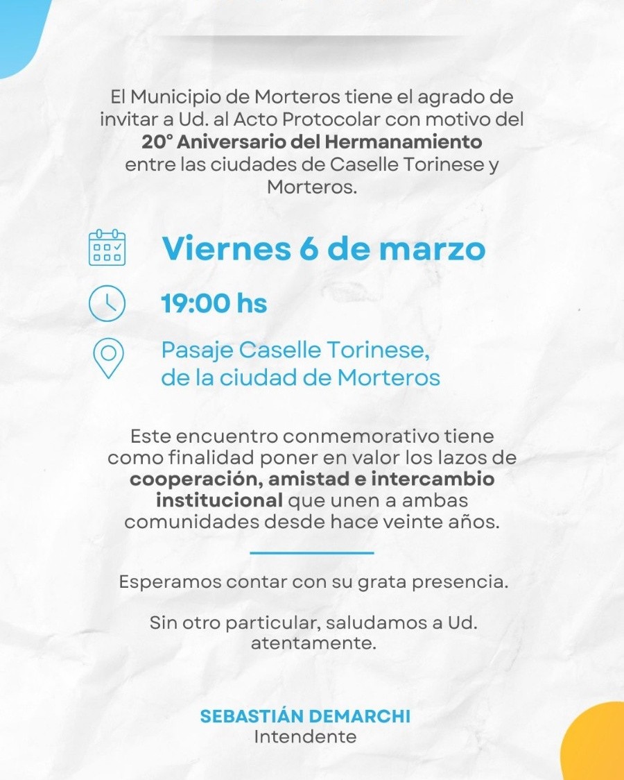 Con un acto protocolar, el Gobierno Municipal de Morteros invita a toda la comunidad a participar del 20° aniversario del Hermanamiento con la ciudad de Caselle Torinese.