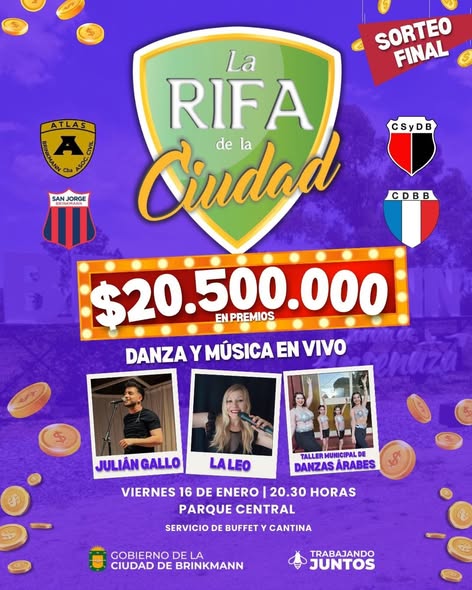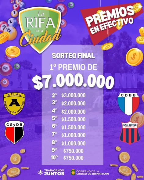 A través del Gobierno Municipal y los Clubes de Brinkmann, se invita a todos los adherentes de la Rifa de la Ciudad al gran sorteo final de la edición 2025, a llevarse a cabo este viernes 16 de enero, con un nuevo formato del evento final.