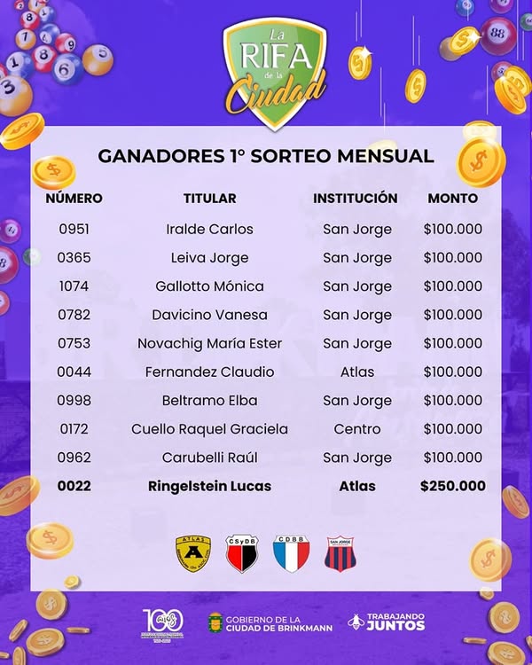 Como estaba previsto, se realizó el primer sorteo de la Rifa de la Ciudad, que organiza el Gobierno Municipal conjuntamente con los clubes locales: Bertossi, Atlas, San Jorge y Centro Social.